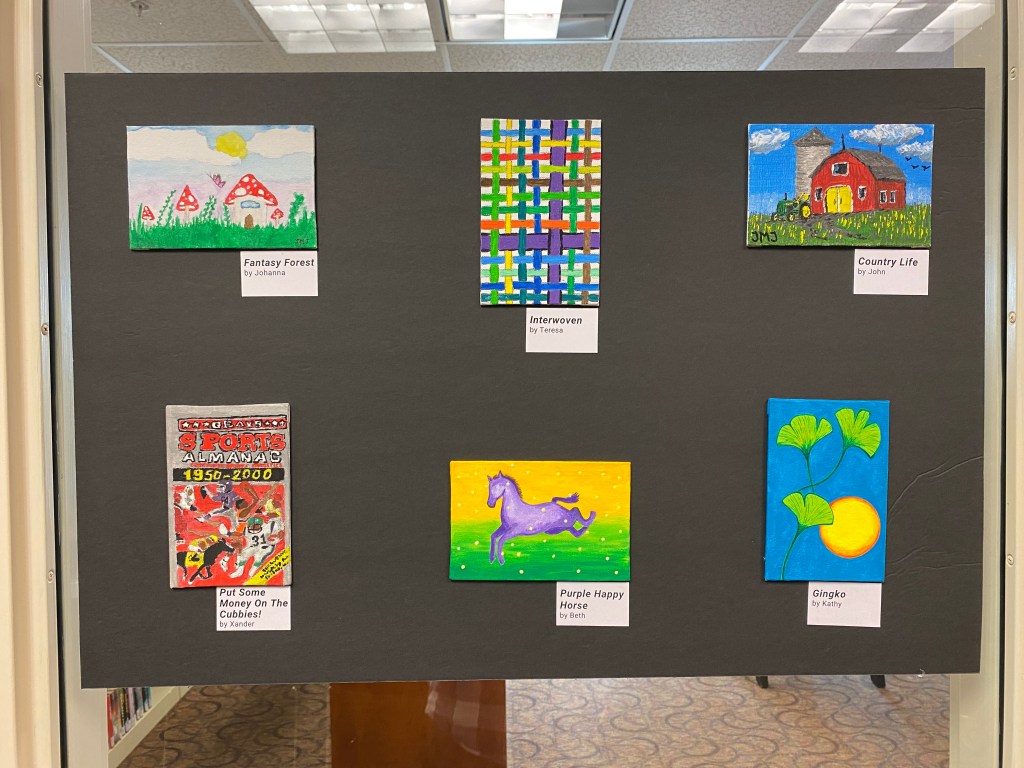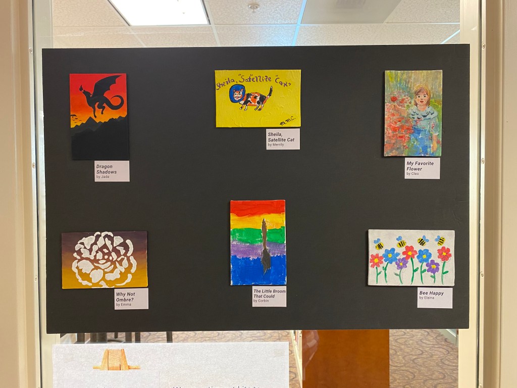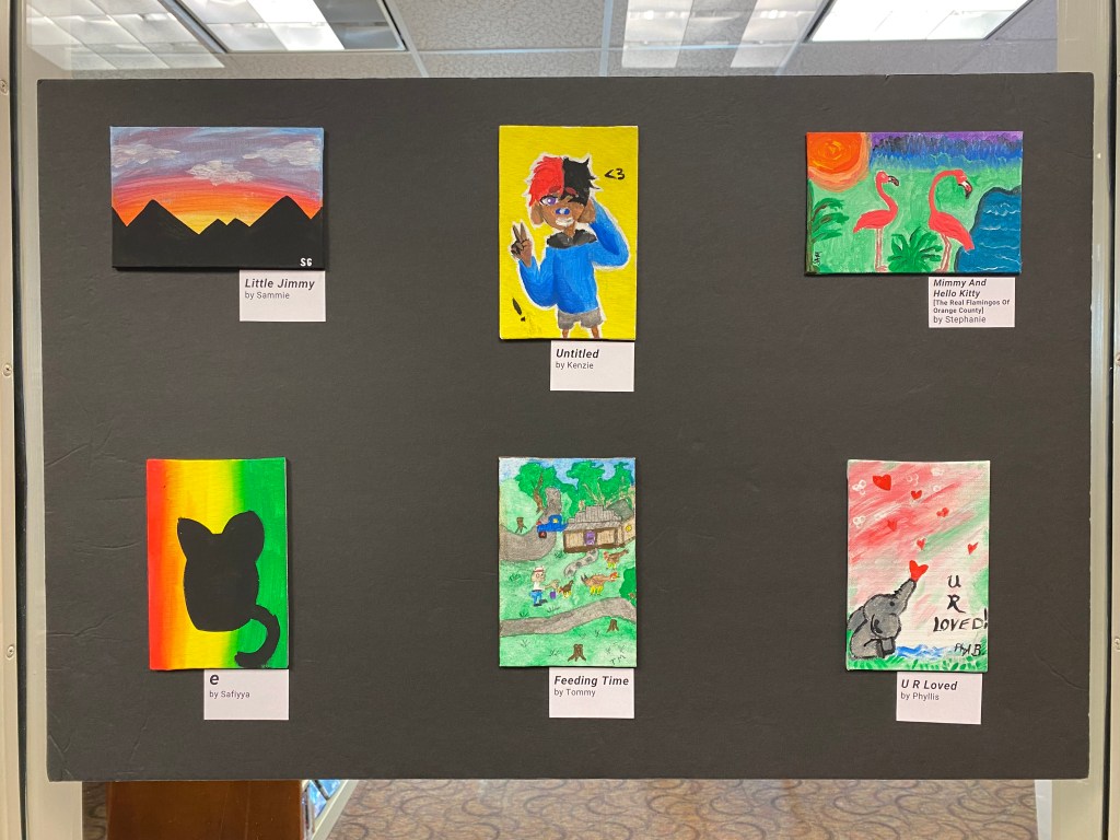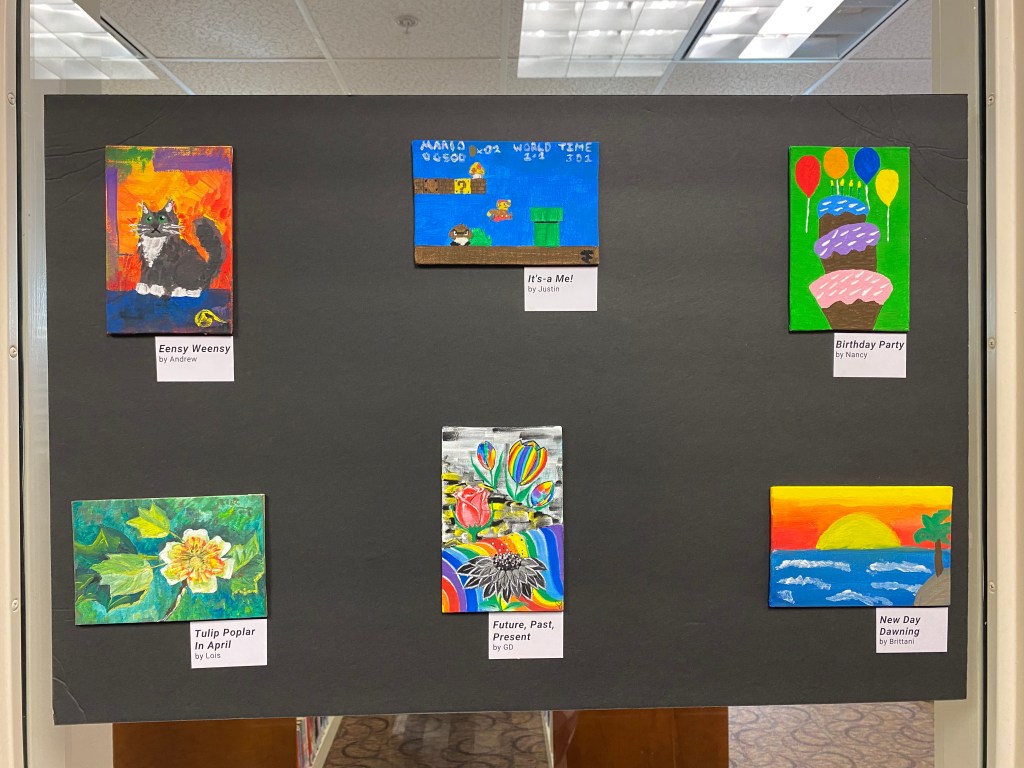 Similar to our Blackout Poetry Slam, we utilized the windows of the library’s Teen Room to exhibit the Tiny Art Show. To provide a better background for viewing the paintings, TL hot glued the canvases and name plaques to six black boards, which were then attached to the windows using Command strips.